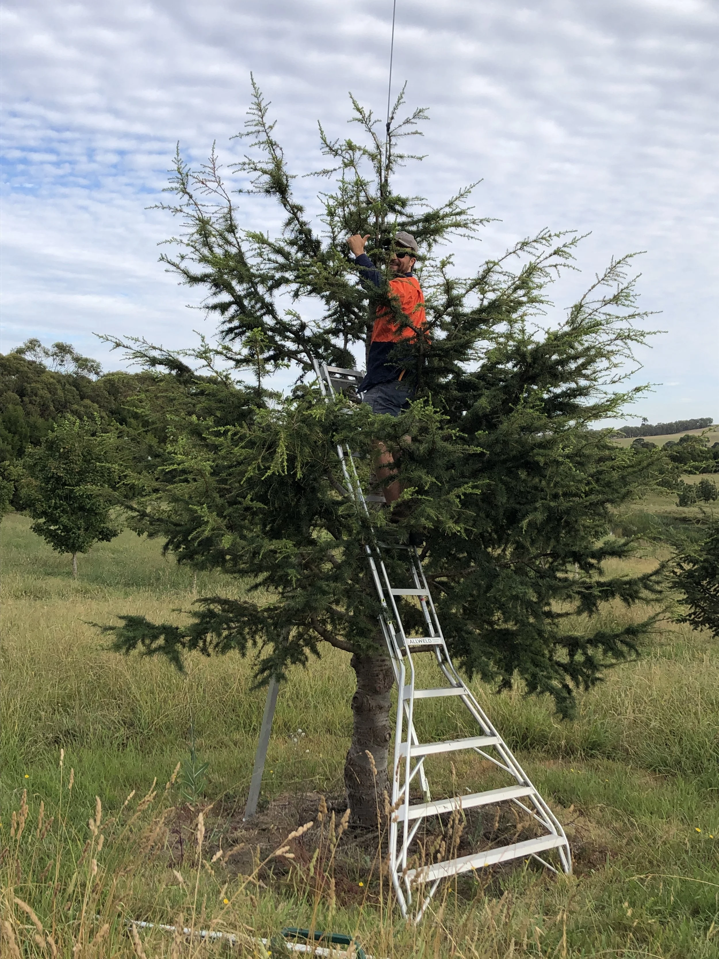 2.22 Mick the arborist erecting ‘aerials’ in the Lebanese cedars to stop the Cockatoos biting out the leaders. (There is a third leg on the ladder if you look carefully)